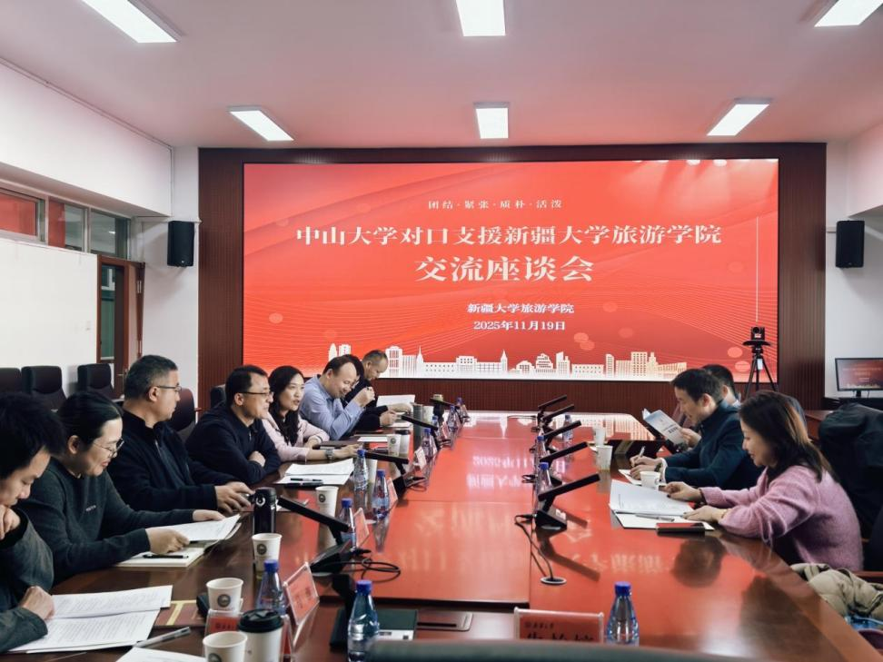 2025年11月19日下午16:00,中山大学对口支援新疆大学旅游学院座谈交流会在新疆大学红湖校区12号楼203会议室顺利召开。本次会议旨在全面总结过去一年对口支援工作成效,深化两校合作机制,共谋高质量发展新路径。
