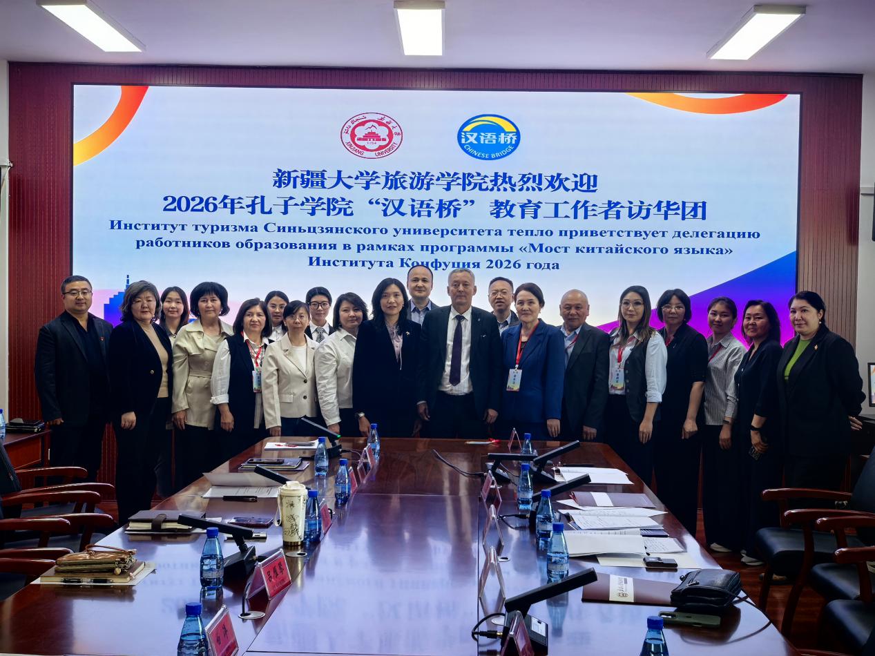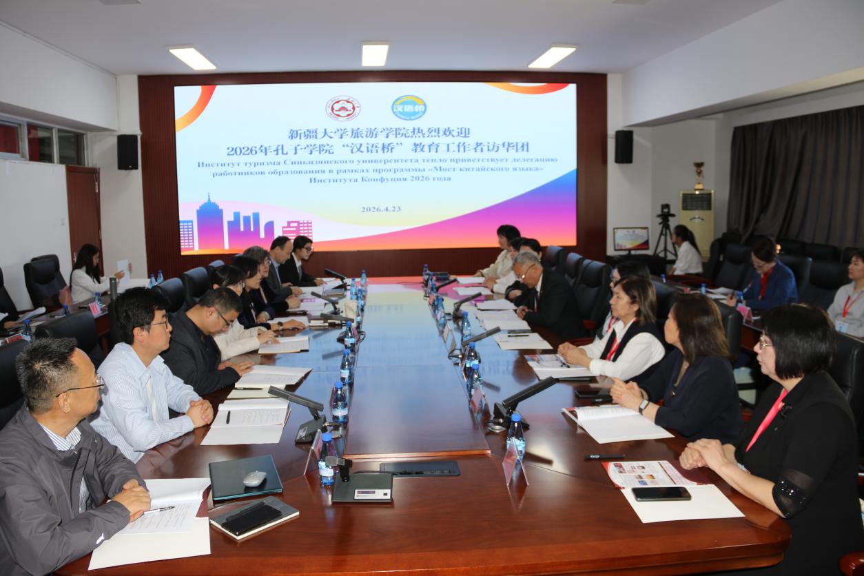 4月23日上午,2026年吉尔吉斯斯坦孔子学院教育工作者“汉语桥”访华团到访新疆大学旅游学院,交流座谈会在红湖校区12号教学楼203会议室举行。